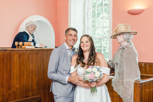 July 2022 saw a very joyous wedding in the courtroom of the Courthouse. A massive thank you to the family for sharing the photos of the day with us. The courtroom was a special venue for Vicky and Tim’s big day, and even canine guests were allowed. The garden was an ideal photo site to showcase a beautiful summer wedding.